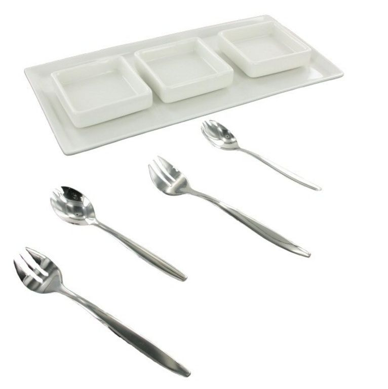 Grande piatto con 3 piccole ciotole su di esso.