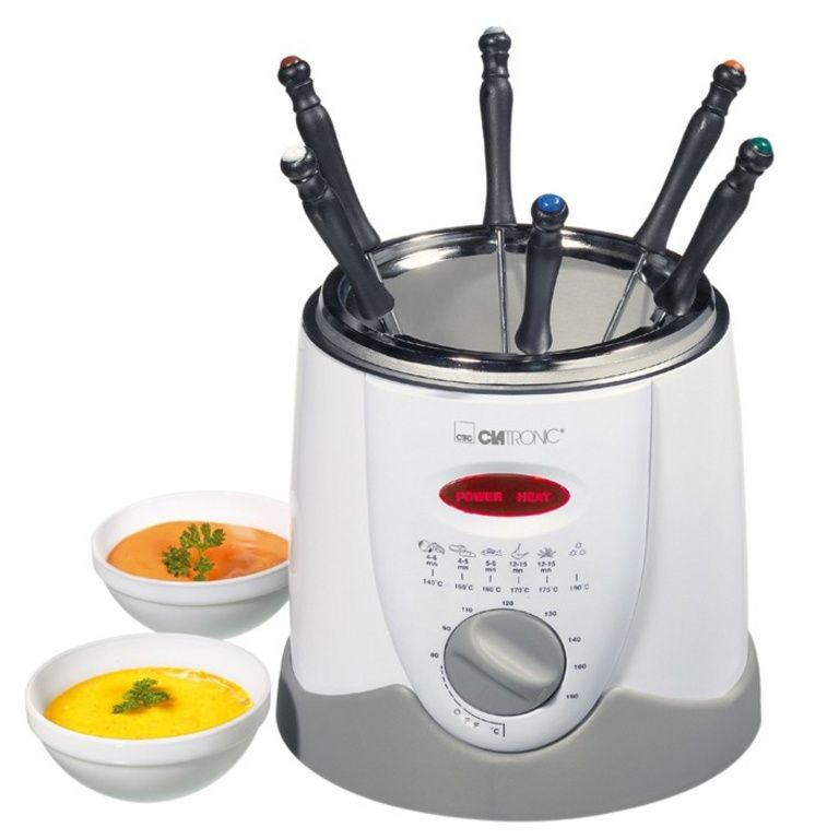 cesto con manico staccabile, 6 forchette da fonduta (di colore) e l'anello di protezione. Odore sostituibile e grasso. Termostato a regolazione continua e surriscaldamento. Contenuto: 1 l. Potenza: 900 W.