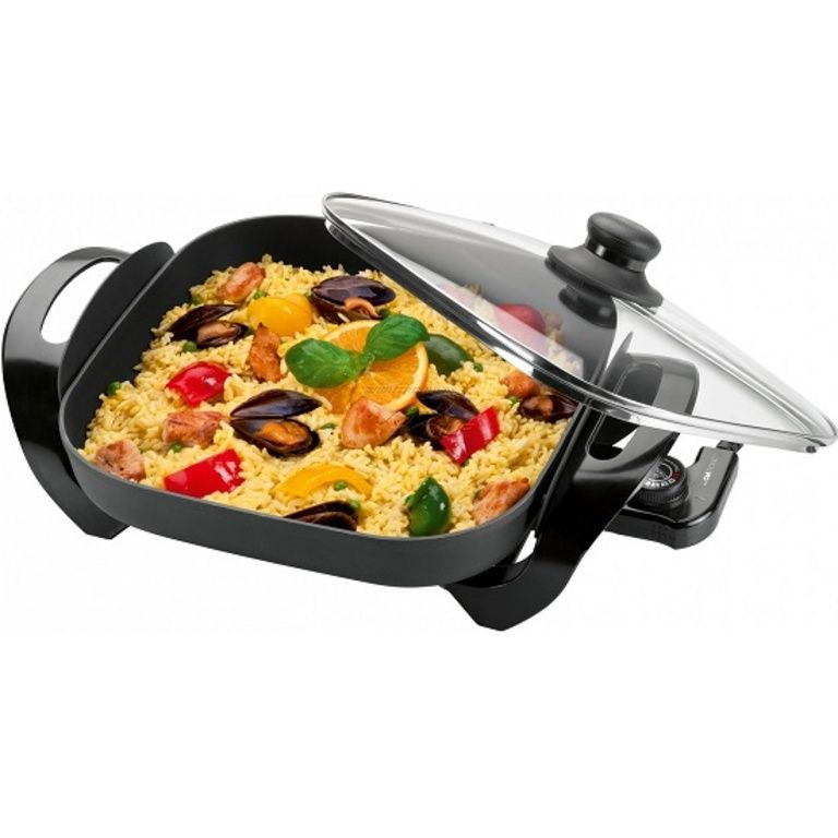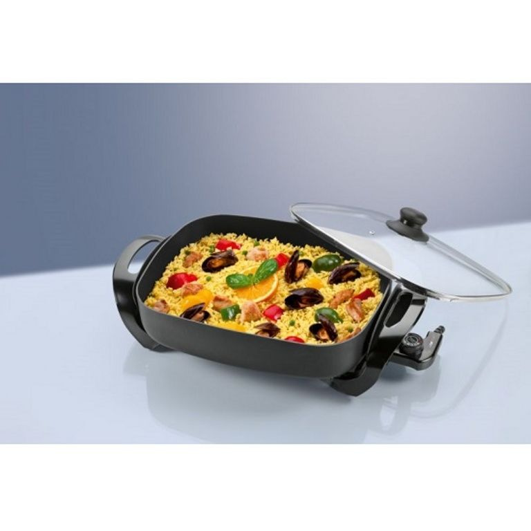 Il partypan di Clatronic PP 3411 è molto versatile e può essere utilizzato per la cottura, cottura a vapore, riscaldamento, scongelamento e tostatura. Con questo piatto si può rapidamente riscaldare il cibo e tenere in caldo. Le maniglie sono isolati e il coperchio di vetro è resistente al calore.