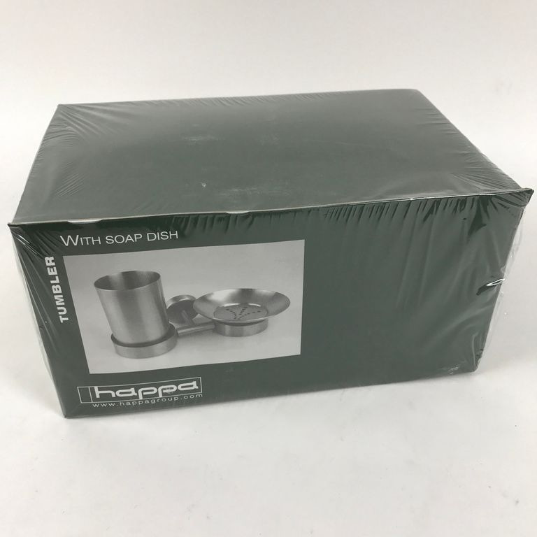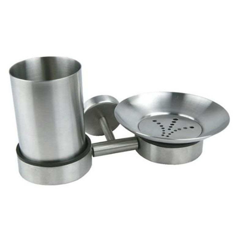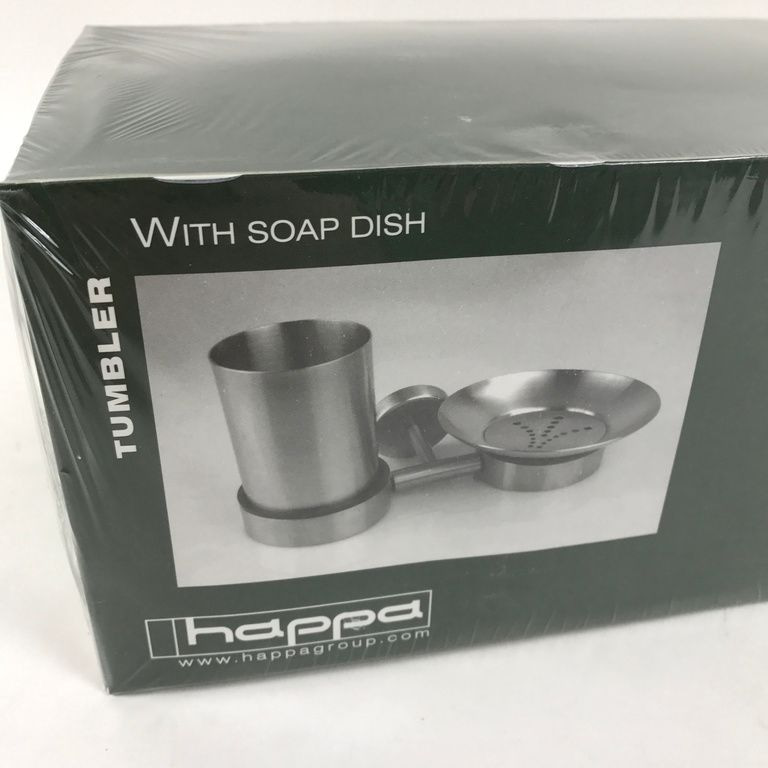 Bagno Cup & Supporto del sapone. Questo set bagno Happa include una piastra in acciaio inox con montaggio a parete. Questo montaggio a parete è posta una tazza per spazzolini da denti, dentifricio e altri attributi. Inoltre, vi è attaccato un piatto per lo svolgimento di sapone sciolto sul posto. Il tutto è realizzato in acciaio inossidabile di alta qualità.