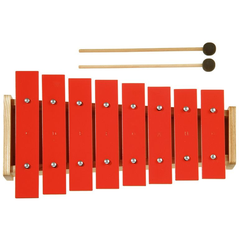 Con i bastoni in mano, il musicista poco la sua musica. Il Metallophone ha un telaio di legno e barre colorate tono.
