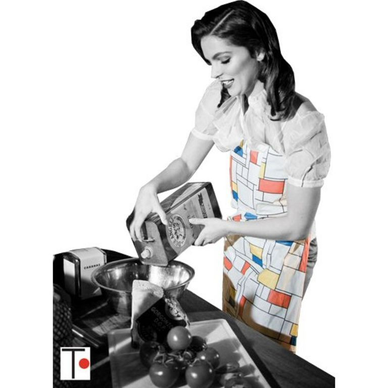 La cucina con design abito Mondrian, si aggrappa con un sistema sottile con grazia intorno alla vita. Il grembiule fa perfettamente e non hai problemi con le "stringhe". Questo non solo è molto confortevole, ma anche elegante che il grembiule di cotone vecchio e sporco.