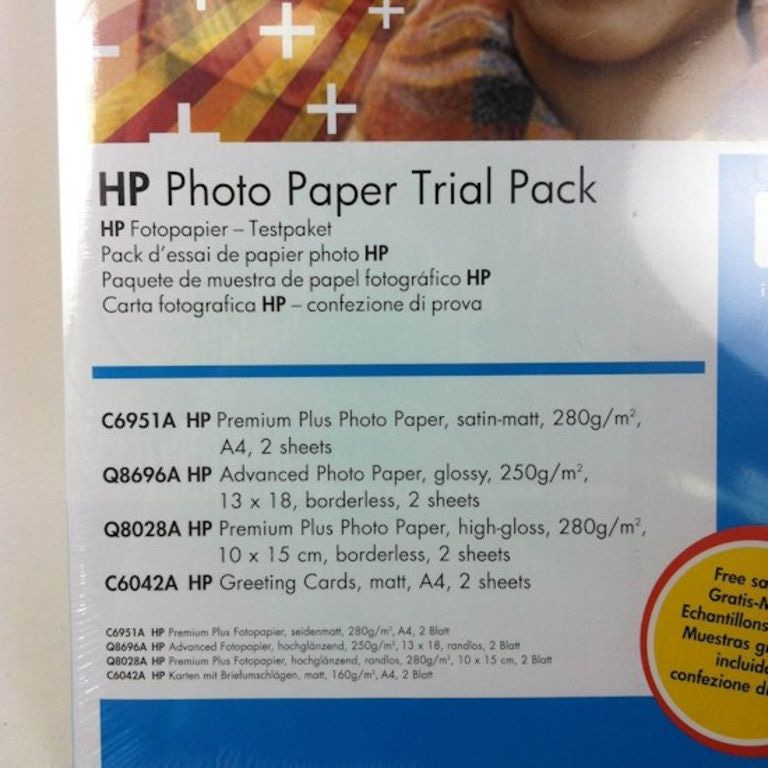 - 2 fogli (Q8696A HP) Advanced Photo Paper, lucida, 250g/m2, 13 x 18 senza bordi.