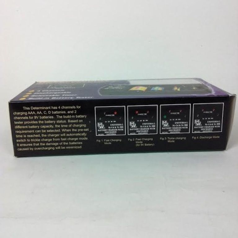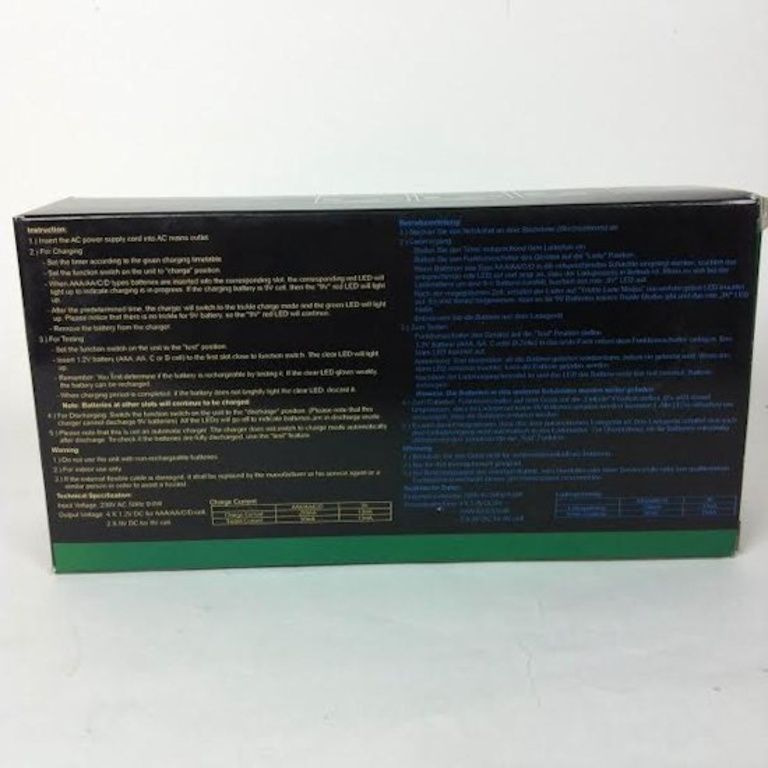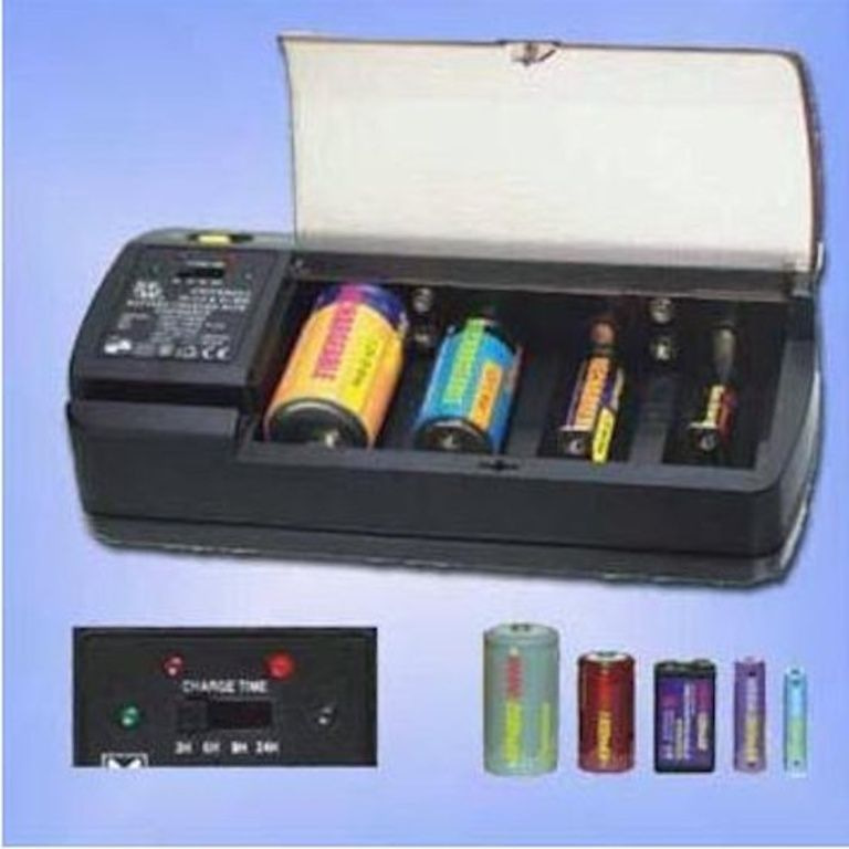 4 canali caricabatterie universale Ni-Cd Ni-MH con il controllo timer selezionabile. Con diverse impostazioni del timer per batterie di diverse capacità. Per 1-4pcs di Micro AAA, Mignon AA, Baby C, Mono D e 1-2pcs 9V Block o Ni-Cd Ni-MH