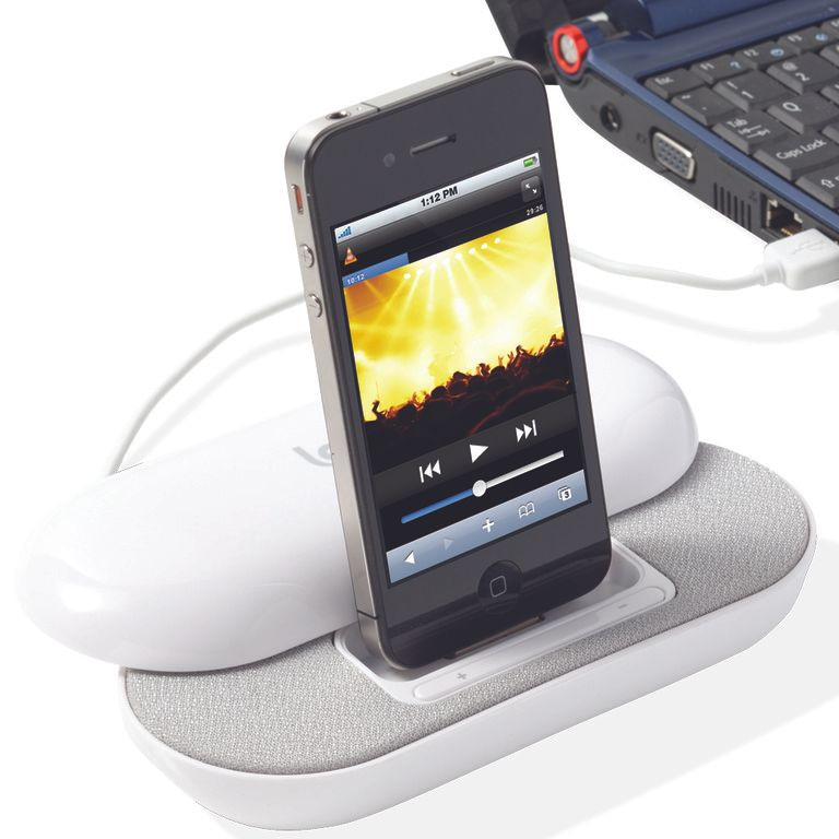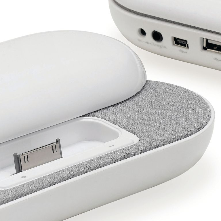 iPhone / iPod (TM) altoparlante stereo attracco. USB 2.0 offre tre porte USB. Adatto per Smartphones, MP3 / MP4, laptop e PC tramite la linea di 3,5 millimetri di cavo in dotazione. Uscita 2 x 1,5 W iPhone / iPod. Materiale: ABS.